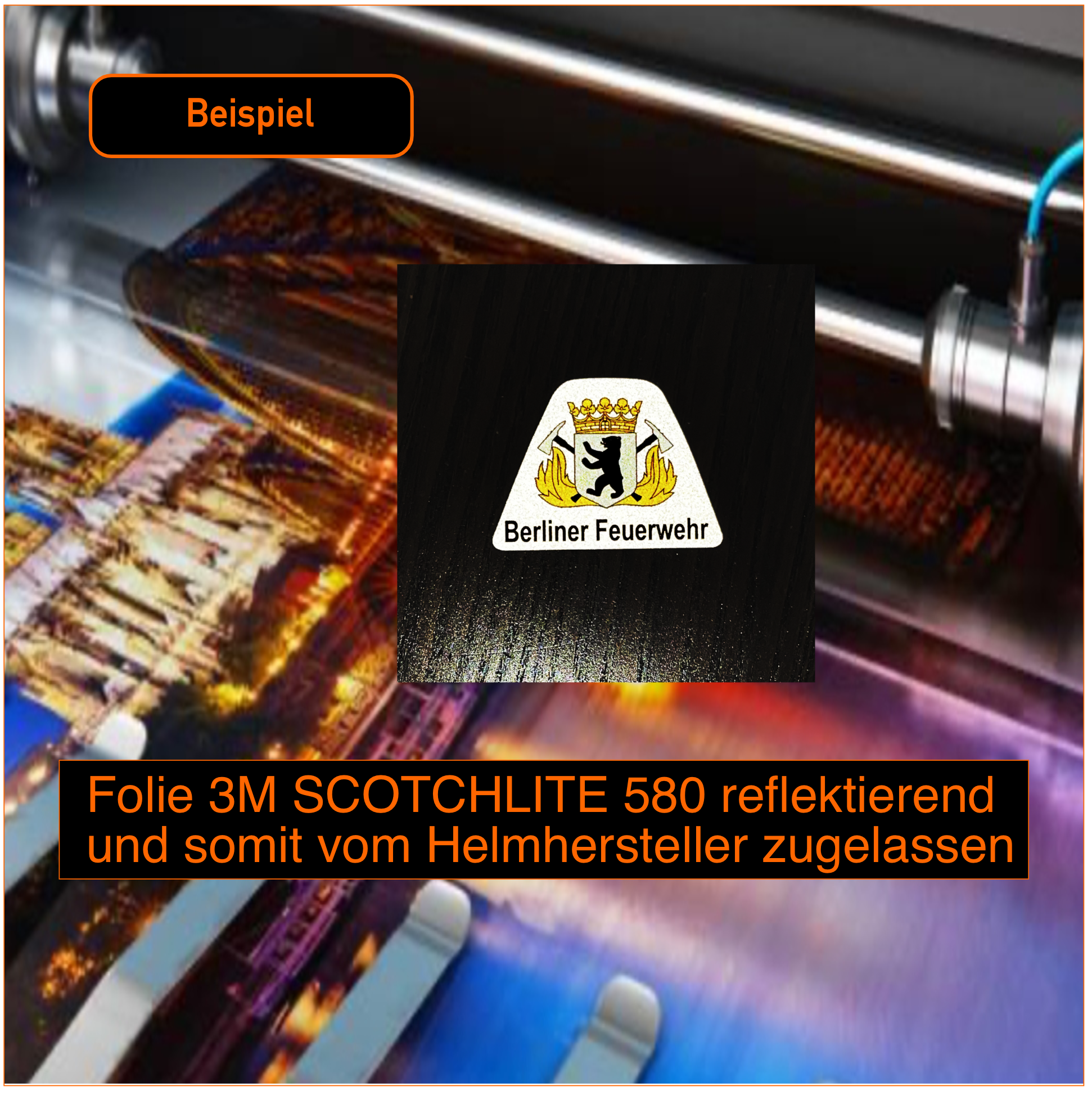 Die Größe und Farbe wird durch die Fa. Bullard vorgegeben. Wir verwenden die Folien 3 M Scotchlite Reflektierende Folie Serie 580 E und entsprechen somit die Bestimmen und Vorgaben aller Helmhersteller.
