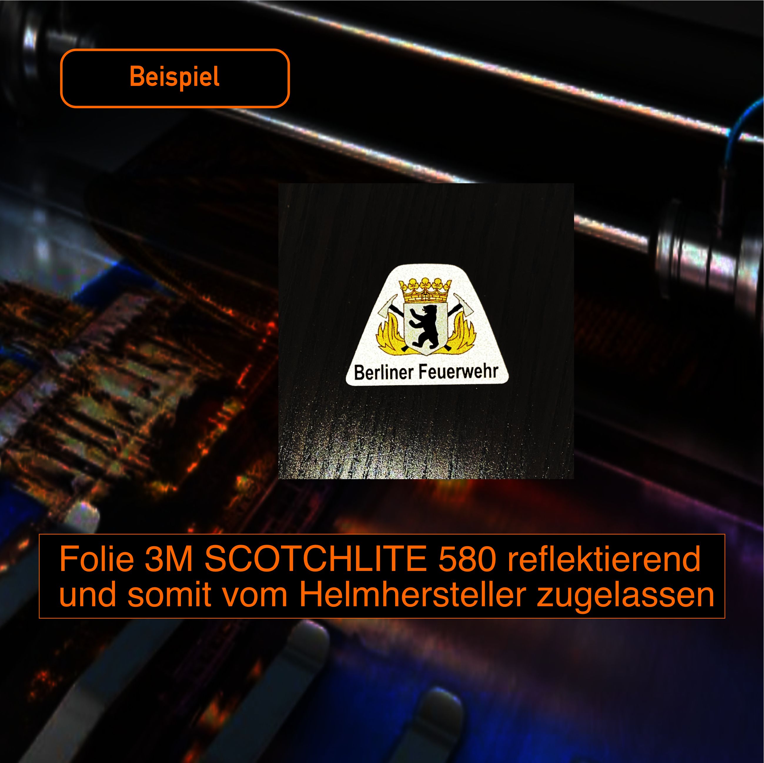Die Größe und Farbe wird durch die Fa. Bullard vorgegeben. Wir verwenden die Folien 3 M Scotchlite Reflektierende Folie Serie 580 E und entsprechen somit die Bestimmen und Vorgaben aller Helmhersteller.