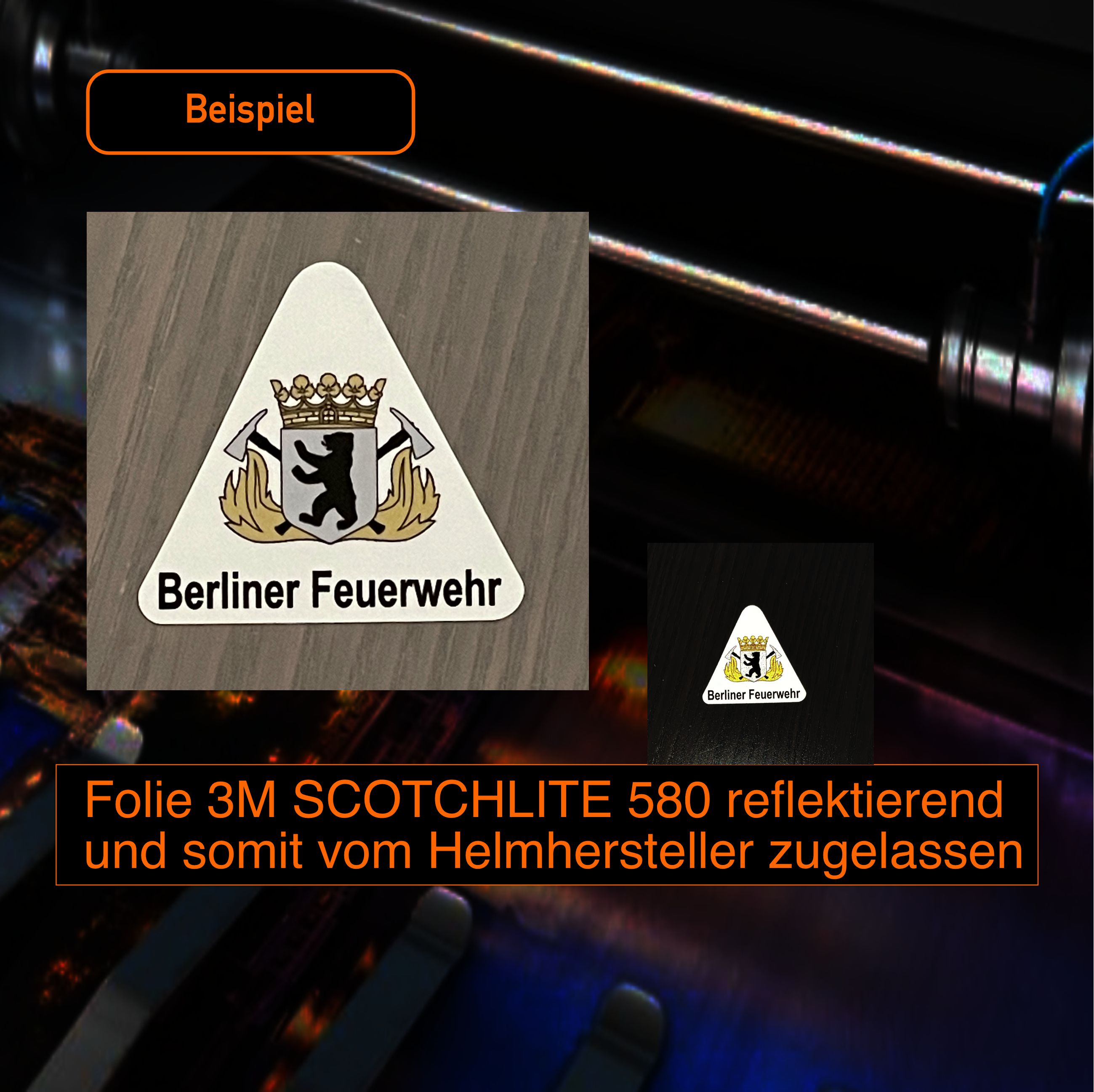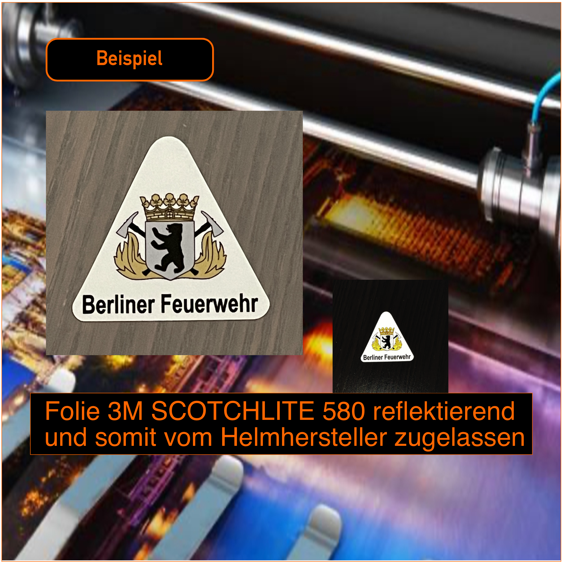 Die Größe und Farbe wird durch die Fa. Schuberth vorgegeben. Wir verwenden die Folien 3 M Scotchlite Reflektierende Folie Serie 580 E und entsprechen somit die Bestimmen und Vorgaben aller Helmhersteller.