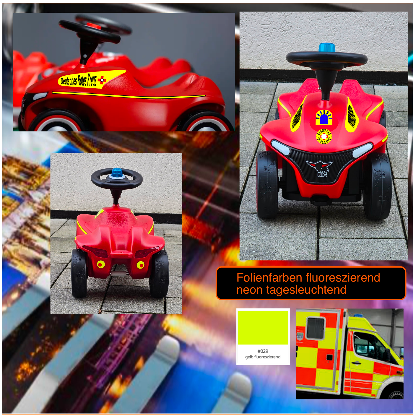 Deutsches Rotes Kreuz Bobby Car NEO , Aufkleber, neongelb tagesleuchtend flourezierend