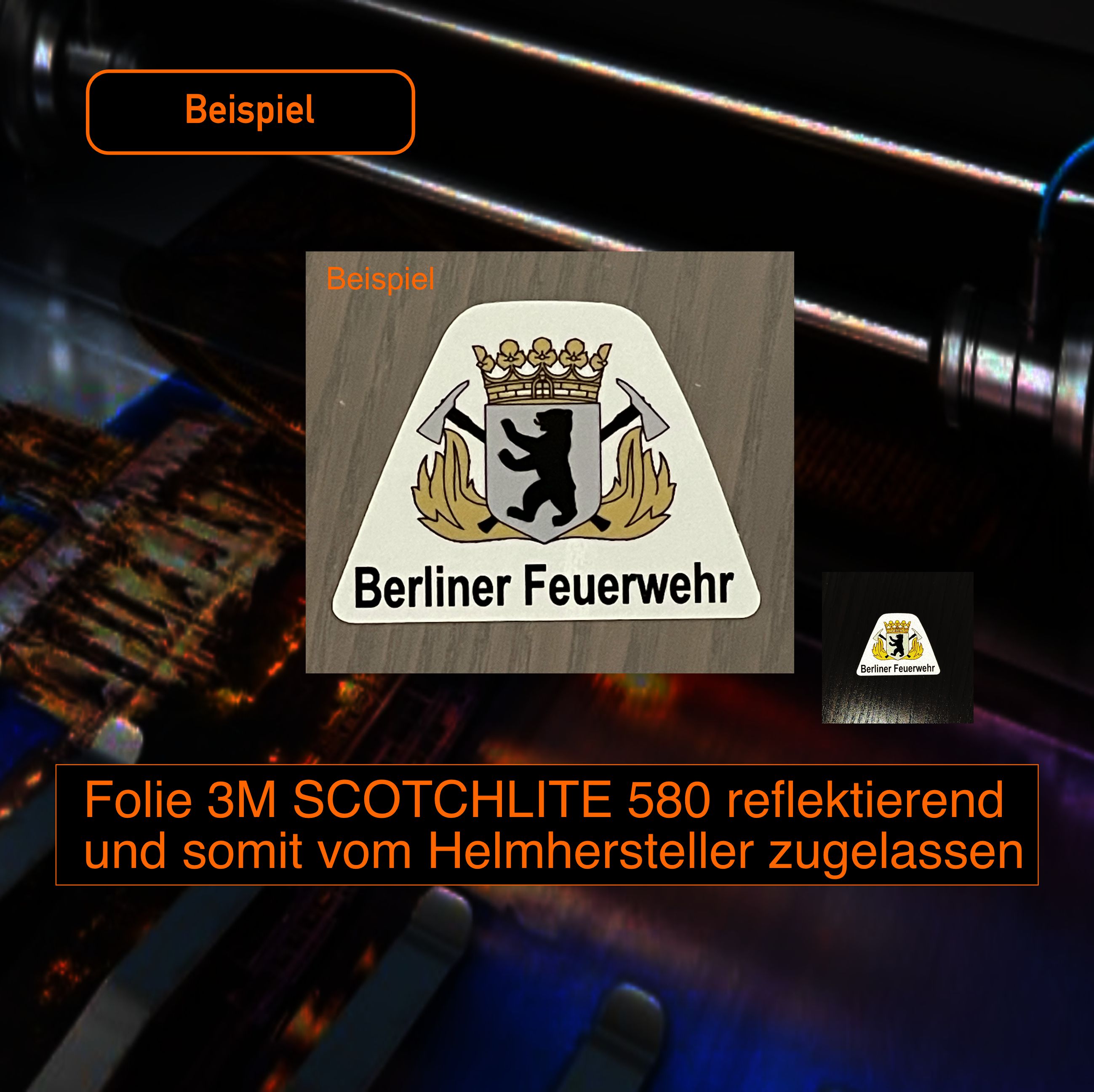 Die Größe und Farbe wird durch die Fa. Schuberth vorgegeben. Wir verwenden die Folien 3 M Scotchlite Reflektierende Folie Serie 580 E und entsprechen somit die Bestimmen und Vorgaben aller Helmhersteller.