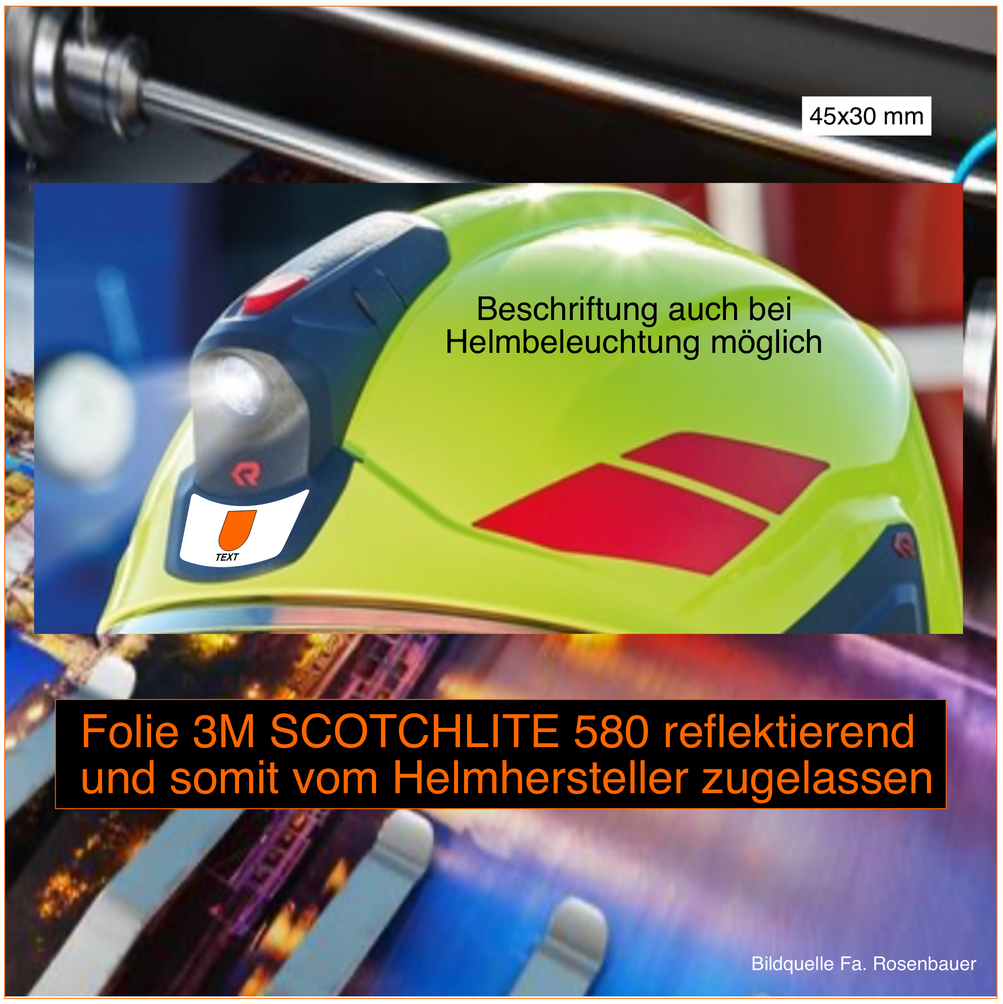 Die Größe und Farbe wird durch die Fa. Rosenbauer vorgegeben. Wir verwenden die Folien 3 M Scotchlite Reflektierende Folie Serie 580 E und entsprechen somit die Bestimmen und Vorgaben aller Helmhersteller.