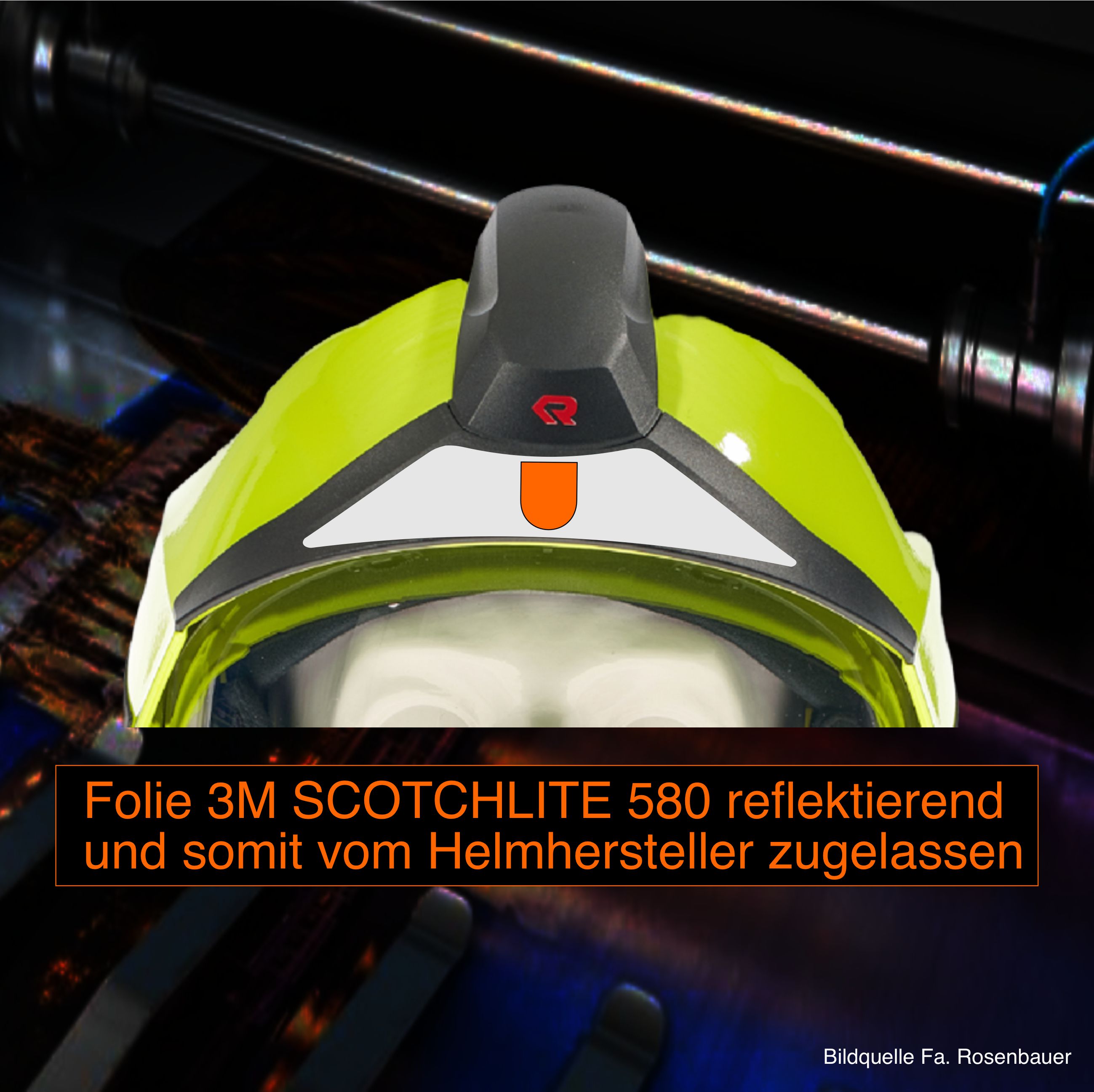 Die Größe und Farbe wird durch die Fa. Rosenbauer vorgegeben. Wir verwenden die Folien 3 M Scotchlite Reflektierende Folie Serie 580 E und entsprechen somit die Bestimmen und Vorgaben aller Helmhersteller.