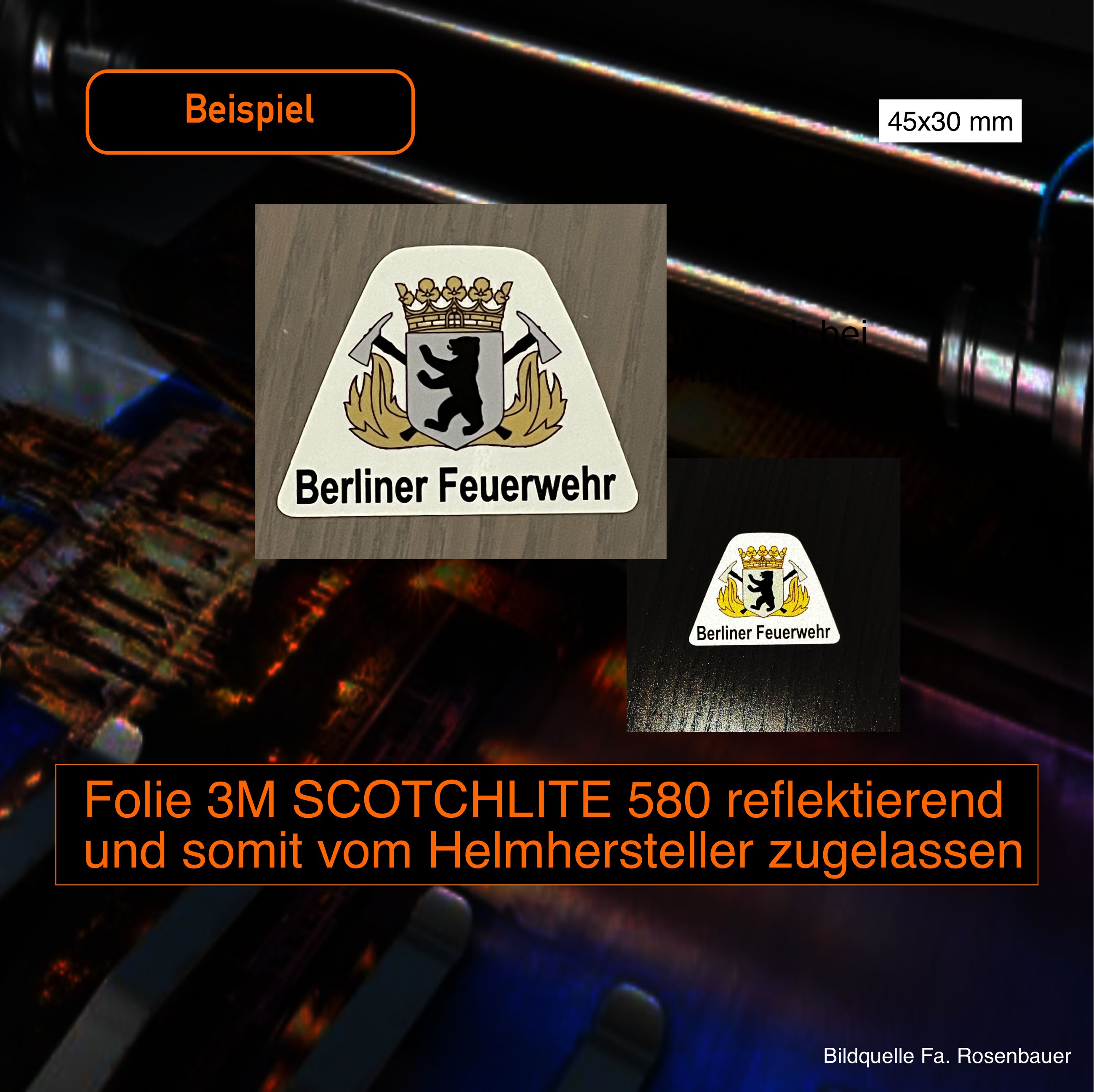 Die Größe und Farbe wird durch die Fa. Schuberth vorgegeben. Wir verwenden die Folien 3 M Scotchlite Reflektierende Folie Serie 580 E und entsprechen somit die Bestimmen und Vorgaben aller Helmhersteller.