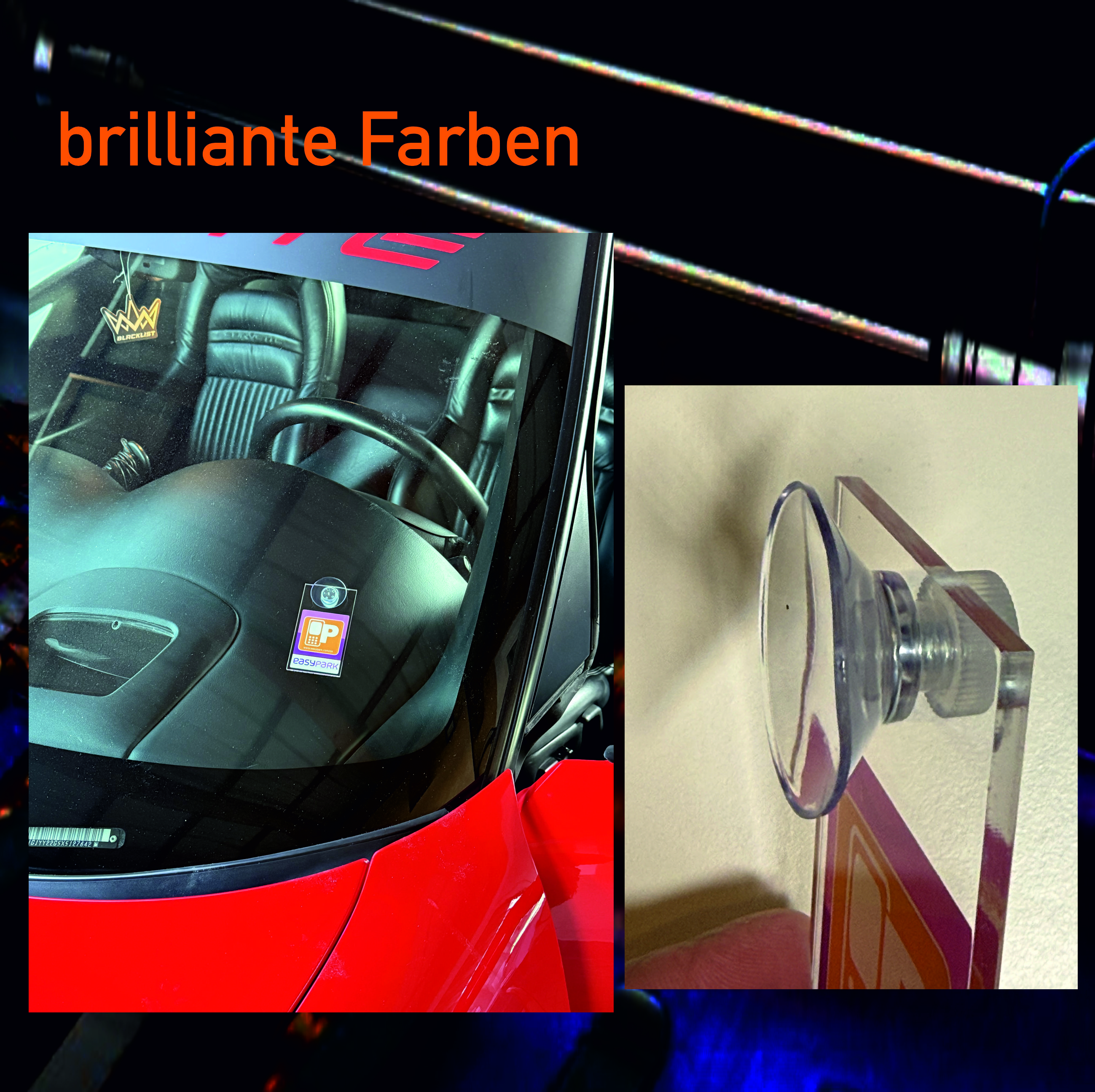 keine Lust auf Aufkleber - mit dem Saufnapf einfach das Schild hinter die Scheibe anbringen